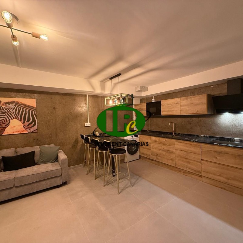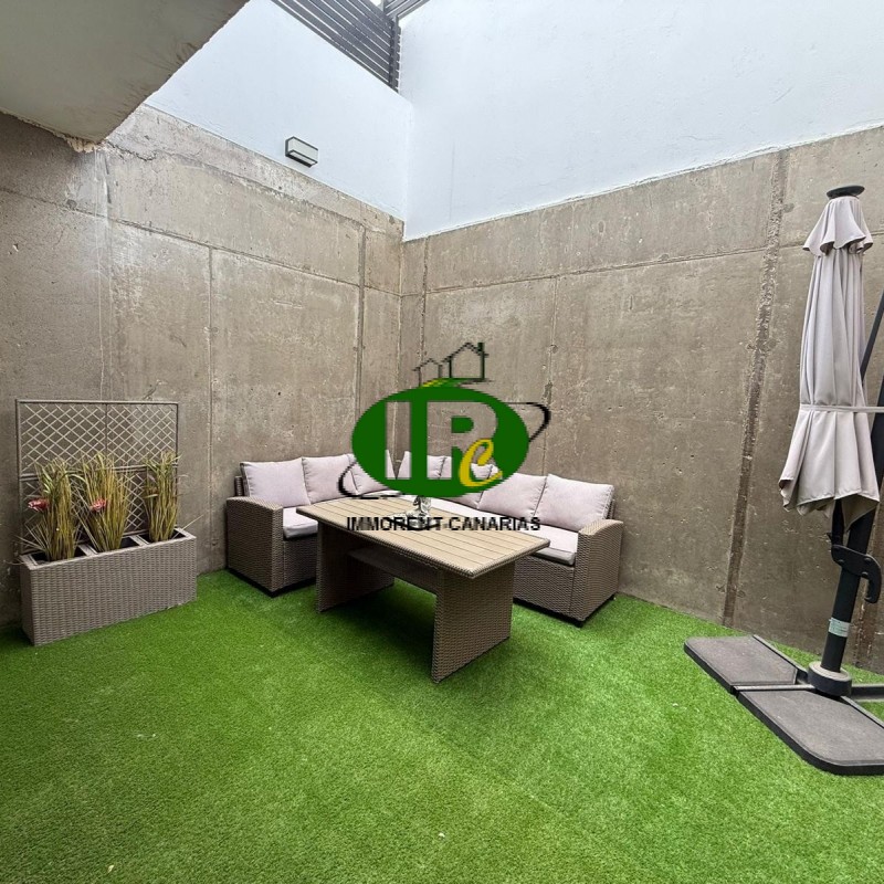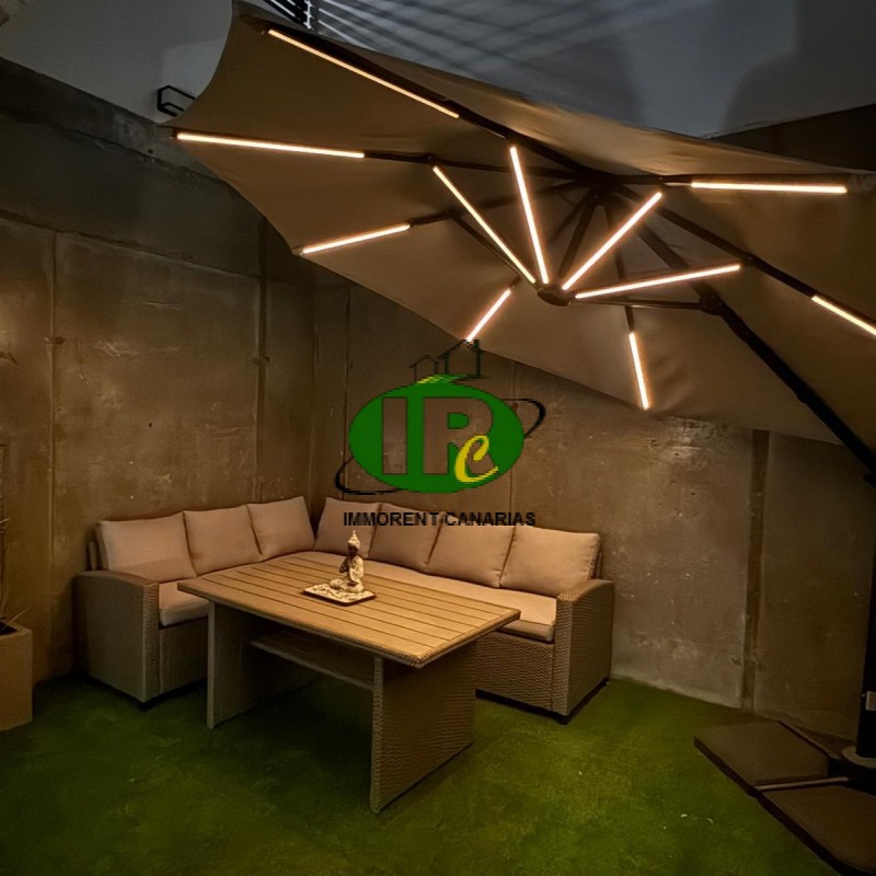 Beautifully renovated semi-detached house with one bedroom and two terraces. Living area with an L-shaped sofa bed, air conditioning, TV, large windows, and access to a small open terrace, which also leads to the outside via a staircase. American-style kitchen with washing machine, ceramic hob, small dishwasher, microwave, breakfast bar, and large refrigerator. Shower room. Bedroom with a double bed, TV, and access to an extra room that could be used as a dressing room or for other purposes. Desk and wardrobe. Access to the second terrace with artificial turf, walled, private, with patio furniture and a large parasol.