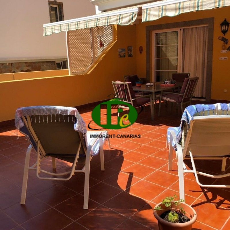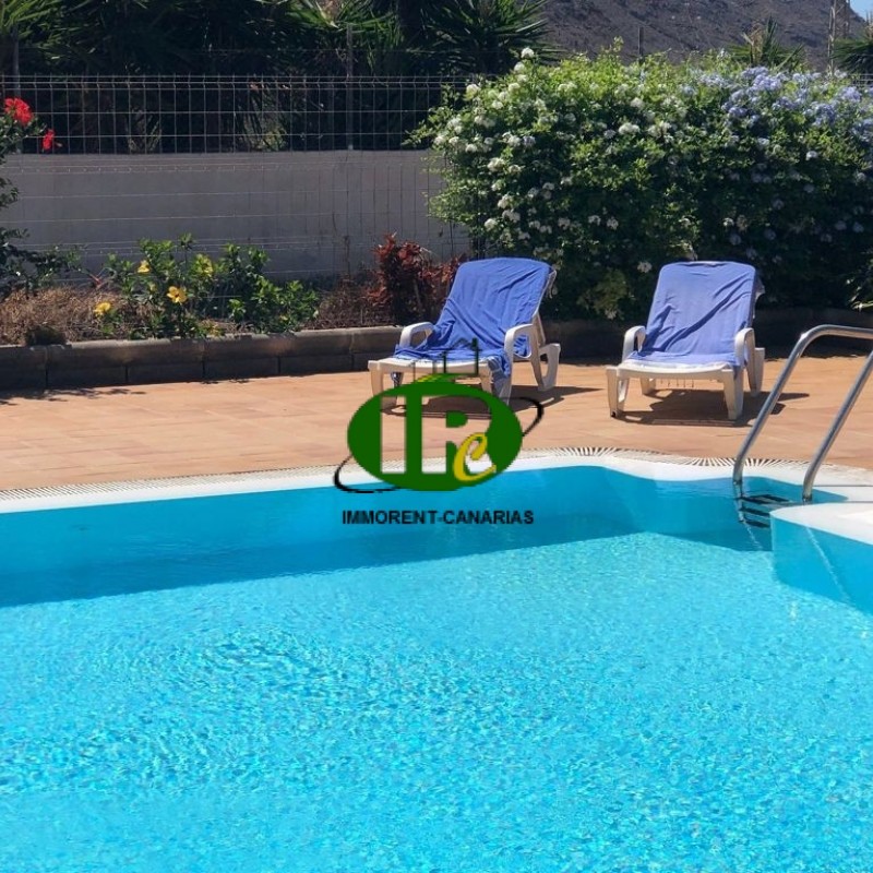 Newly renovated one-bedroom apartment in a quiet location. The living room features a three-seater sofa, a sideboard, TV, and air conditioning. It opens onto a large terrace with sea views, furnished with a seating area, sun loungers, and an awning. The American-style kitchen includes a large refrigerator, ceramic cooktop, and dining table. The bedroom has a double bed and a wardrobe. One garage parking space is included. Additional parking is available in front of the building. There is a communal swimming pool. The complex is quiet and just a short drive from the beach and the Puerto de Mogan shopping center.