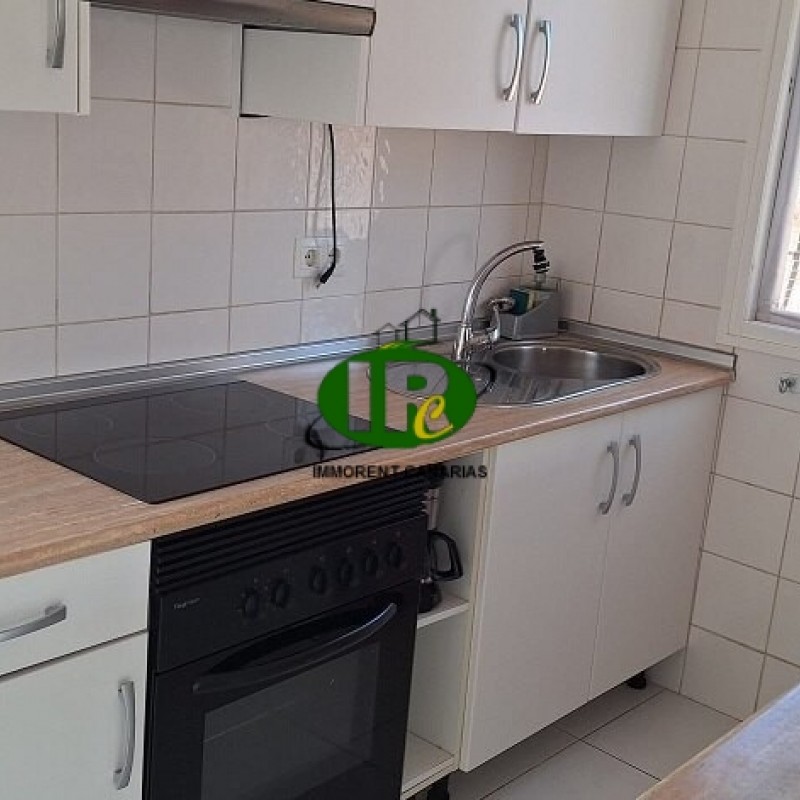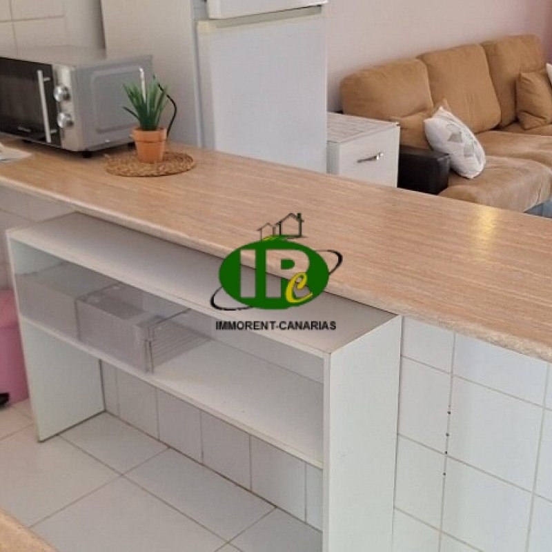 2 bedrooms, en-suite bathroom, open-plan kitchen with 4-burner ceramic hob and oven, large refrigerator, and breakfast bar.