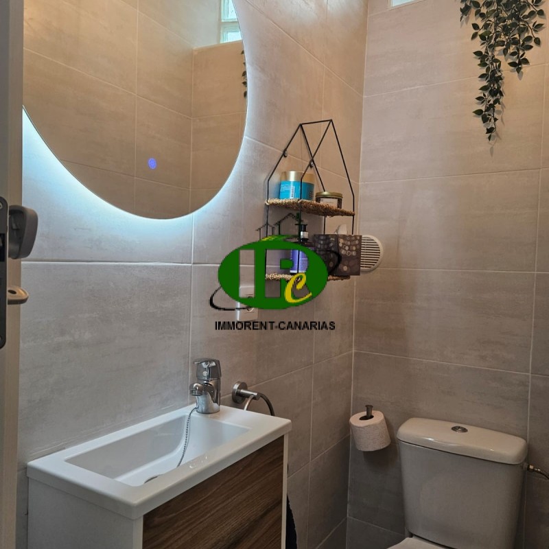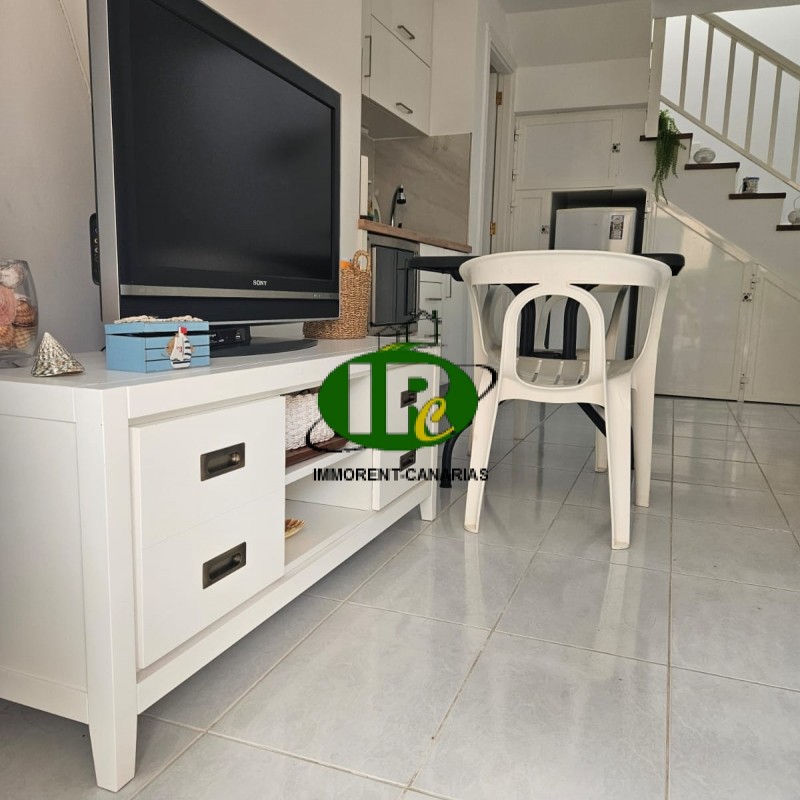 Precioso bungalow dúplex de un dormitorio. Ubicado en un complejo tranquilo. A unos 15 km (en línea recta) del faro y la playa de Maspalomas. Salón con amplio sofá cama, mesa de comedor, canales internacionales, televisión por satélite Astra y aire acondicionado. Cuarto de baño con ducha y lavadora. Dormitorio en la planta superior con cama doble, armario, aire acondicionado y un pequeño balcón. Cocina americana con vitrocerámica de dos fuegos, microondas con horno y frigorífico grande.