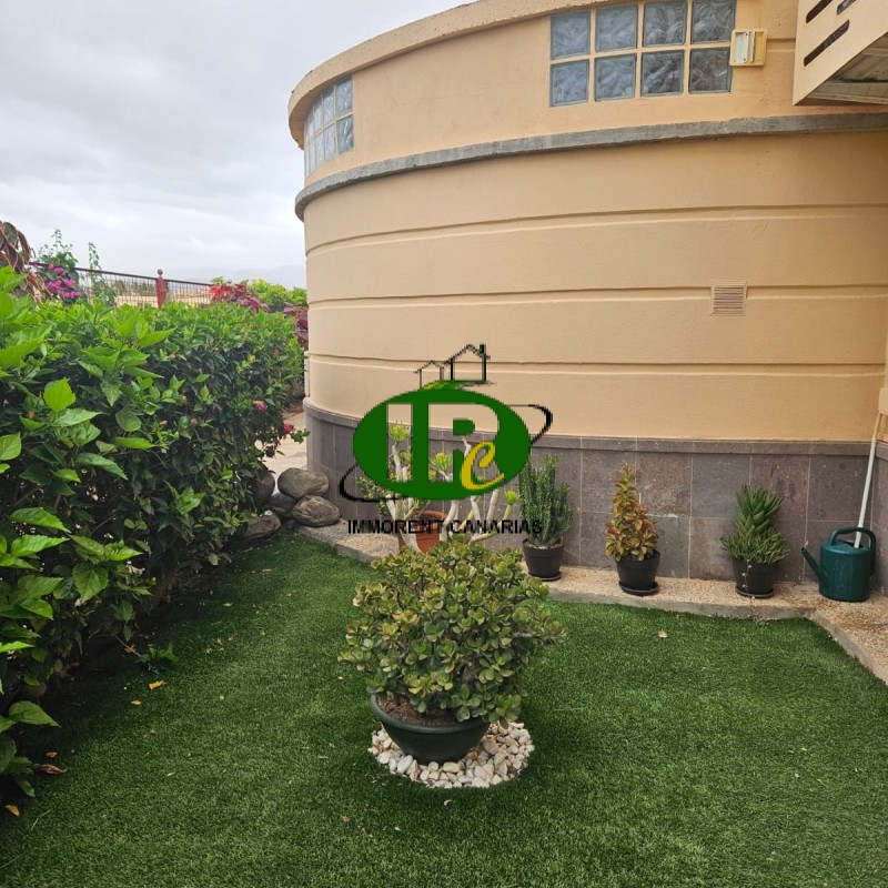 Terraza embaldosada con césped artificial, parcialmente separada por un seto. Zona de estar. Piscina comunitaria.