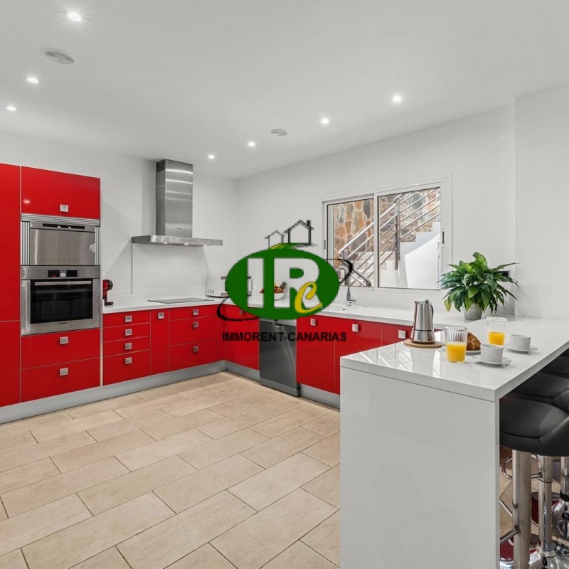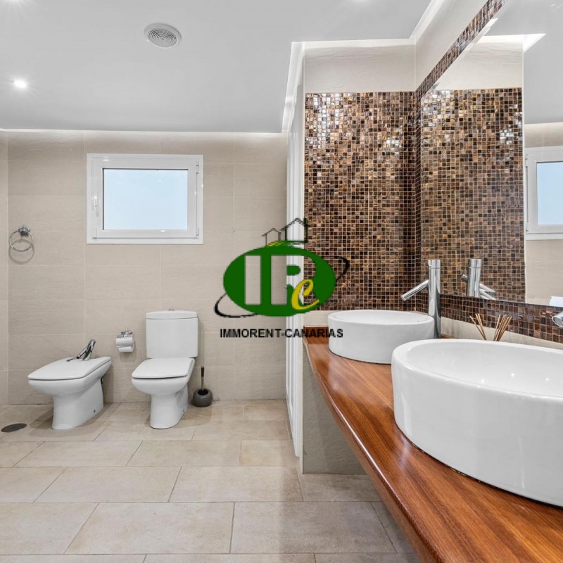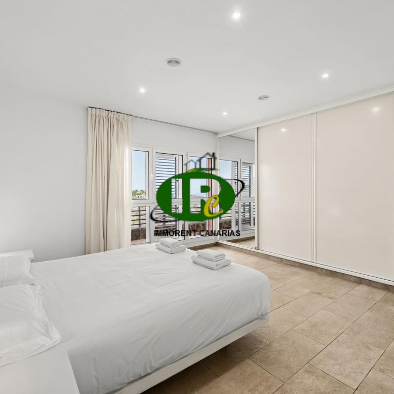 Prachtige, zeer ruime twee-onder-een-kapwoning. Met 3 slaapkamers, 3 badkamers, een groot terras en balkons. Zeezicht. Entree via een trap. Eén parkeerplaats binnen. Buiten, in de hal voor de entree, vindt u de wasmachine, droger en een kast voor schoonmaakspullen, enz. Vanuit de hal komt u in een zeer ruime open keuken. Deze is voorzien van een keramische kookplaat, vaatwasser, oven, magnetron en een grote Amerikaanse koelkast. Naast de keuken is een grote extra kamer met zeer grote kasten voor opbergruimte. Ontbijtbar. Vanuit de hal heeft u toegang tot de drie slaapkamers. De eerste slaapkamer is ongemeubileerd, maar de eigenaar kan op verzoek extra bedden plaatsen. De kamer kan ook voor andere doeleinden worden gebruikt zonder bedden. De tweede slaapkamer heeft een grote kledingkast, een bureau en toegang tot het balkon. Er is een doucheruimte met een bidet en een raam. De derde slaapkamer heeft een tweepersoonsbed, een grote kledingkast, een tv, toegang tot het balkon en een en-suite badkamer. De tweede badkamer heeft twee wastafels, een douche en een raam.